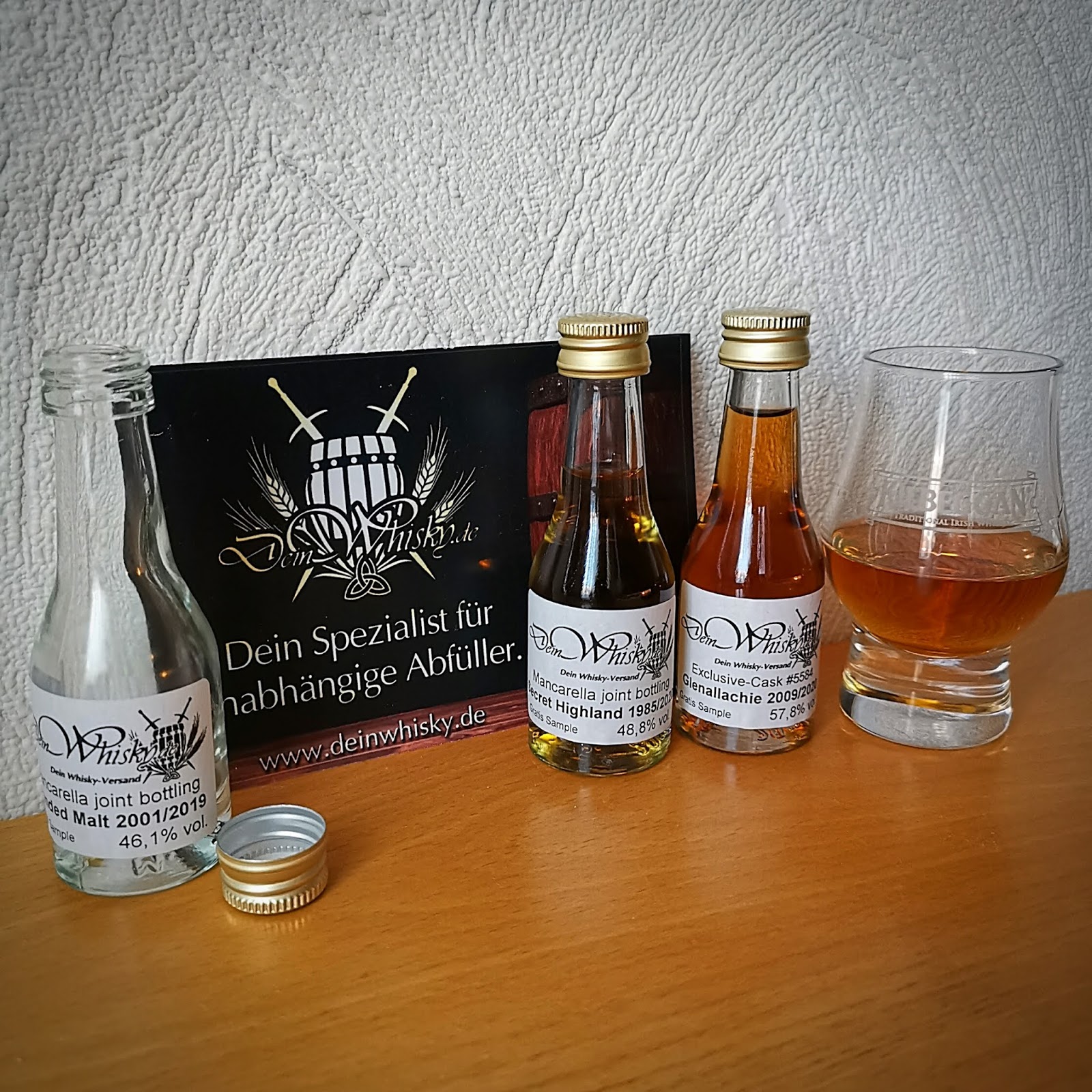 Es ist noch gar nicht lange her, da habe ich an dieser Stelle drei Exklusivabfüllungen von deinwhisky.de vorgestellt. Nur kurz danach klingelte der Postbote erneut bei mir und drückte mir einen Maxibrief mit drei neuen Samples in die Hand. Der Absender: Deinwhisky.de! Mit dabei auch ein sehr interessanter Glenallachie 2009/2020 aus einem Oloroso Puncheon, auf den ich schon extrem gespannt bin. Dazu kommen zwei Joint Bottlings mit Mancarella, nämlich ein Blended Malt 2001/2019 aus dem Sherry Butt. Blended Malt und Einzelfass, passt das zusammen? Grundsätzlich spricht hier einiges dafür, dass es sich um einen Teaspooned handelt, also einen Single Malt, der offiziell ein paar Tropfen aus einer anderen Destillerie abbekommen hat. Der zweite Mancarella ist ein Secret Highland 1985/2020, der als elegante Oldschool Abfüllung beworben wird mit u.a. wachsigen Noten. Das könnte doch durchaus ein Hinweis auf die Destillerie geben, die hinter dem Bottling steckt.